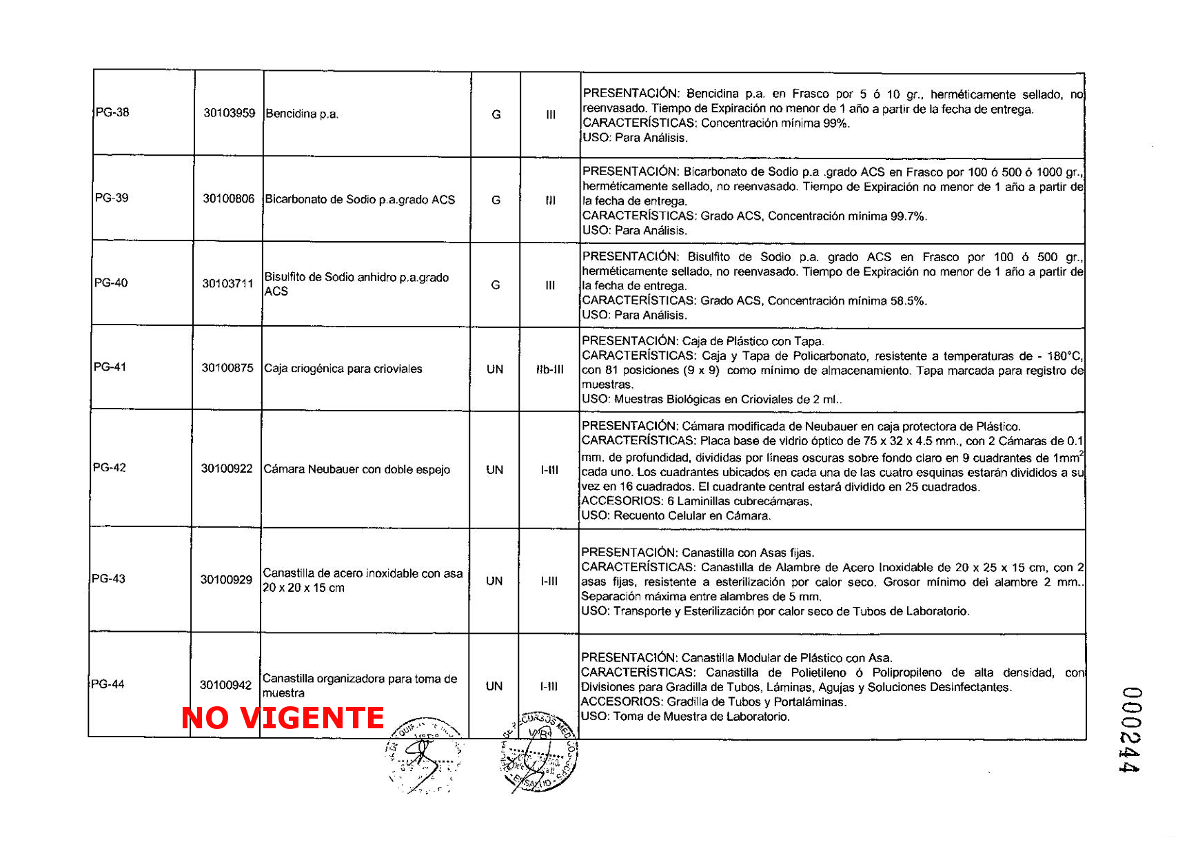| 30100806 | Bicarbonato de Sodio p.a.grado ACS | Resolución N°148-GCPS-ESSALUD-2014 | 09/10/2014 | |